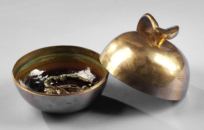 A small bronze apple core doubles as a stash box, playing with temptation and restraint—inviting touch even as its title warns against it.