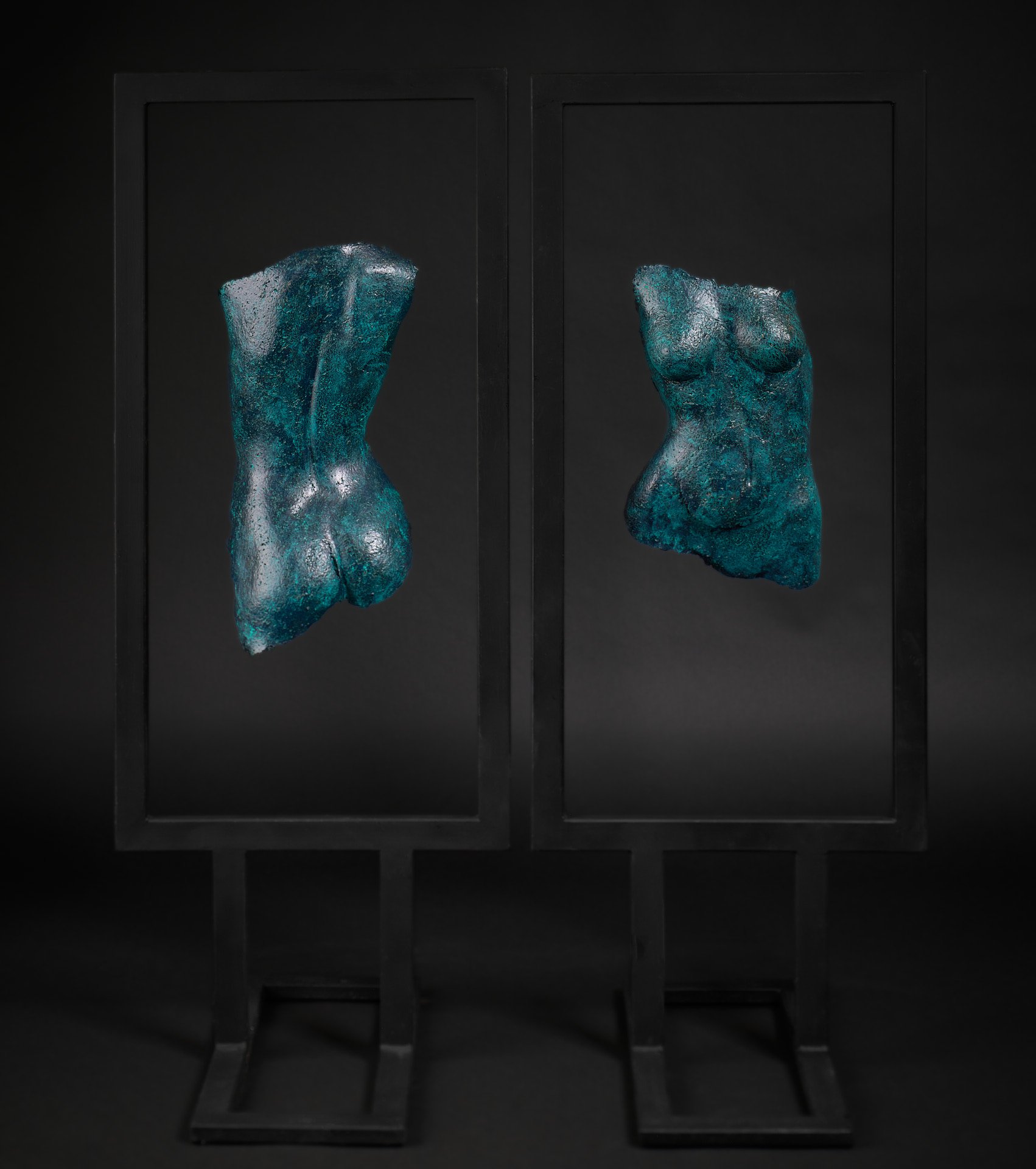 Two paired torsos act as mirrored versions of the self—one outwardly composed, the other marked by memory—holding the tension between appearance and internal truth.